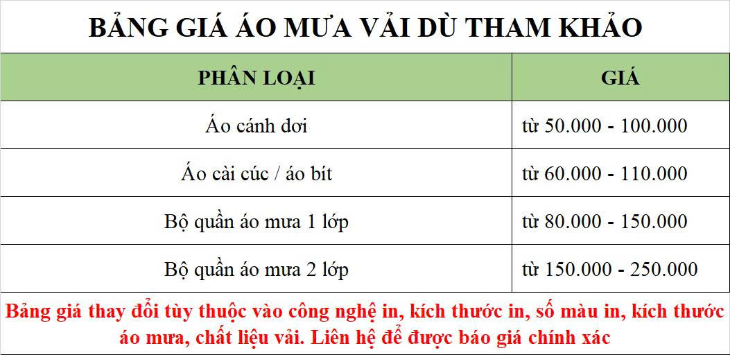 Quý khách có thể tham khảo bảng giá của chúng tôi tại đây để có cái nhìn tổng quan về giá sản phẩm áo mưa in logo: